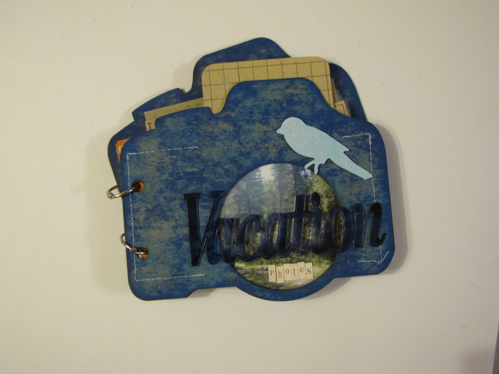 This is a chipboard album shaped like a camera. The front page actually has a hole in it (lense) and I've placed a circle of acrylic behind it and then a scenery picture behind that so it acts more as a window. I've also used one of our Small Expressions words on this album and called it a Vacation Photo album. Instead of leaving all 5 pages of this chipboard album intact, I've used only a couple of them and I've cut down several pages of Hockey Card album pages making this into a photo album you could just slip photos into sleeves in. I like it. I think I'd like to make more like this...quick and easy.